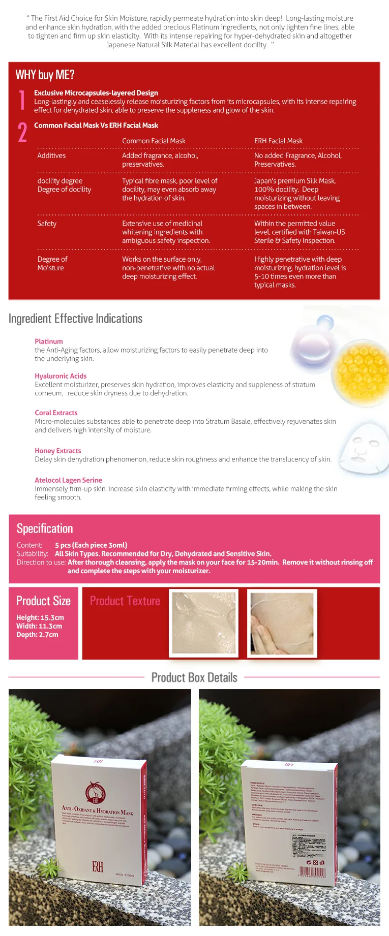 The First Aid Choice for Skin Moisture, rapidly permeate hydration into skin deep! Long-lasting moisture and enhance skin hydration, with the added precious Platinum ingredients, not only lighten fine lines, able to tighten and firm up skin elasticity. With its intense repairing for hyper-dehydrated skin and altogether Japanese Natural Silk Material has excellent docility.